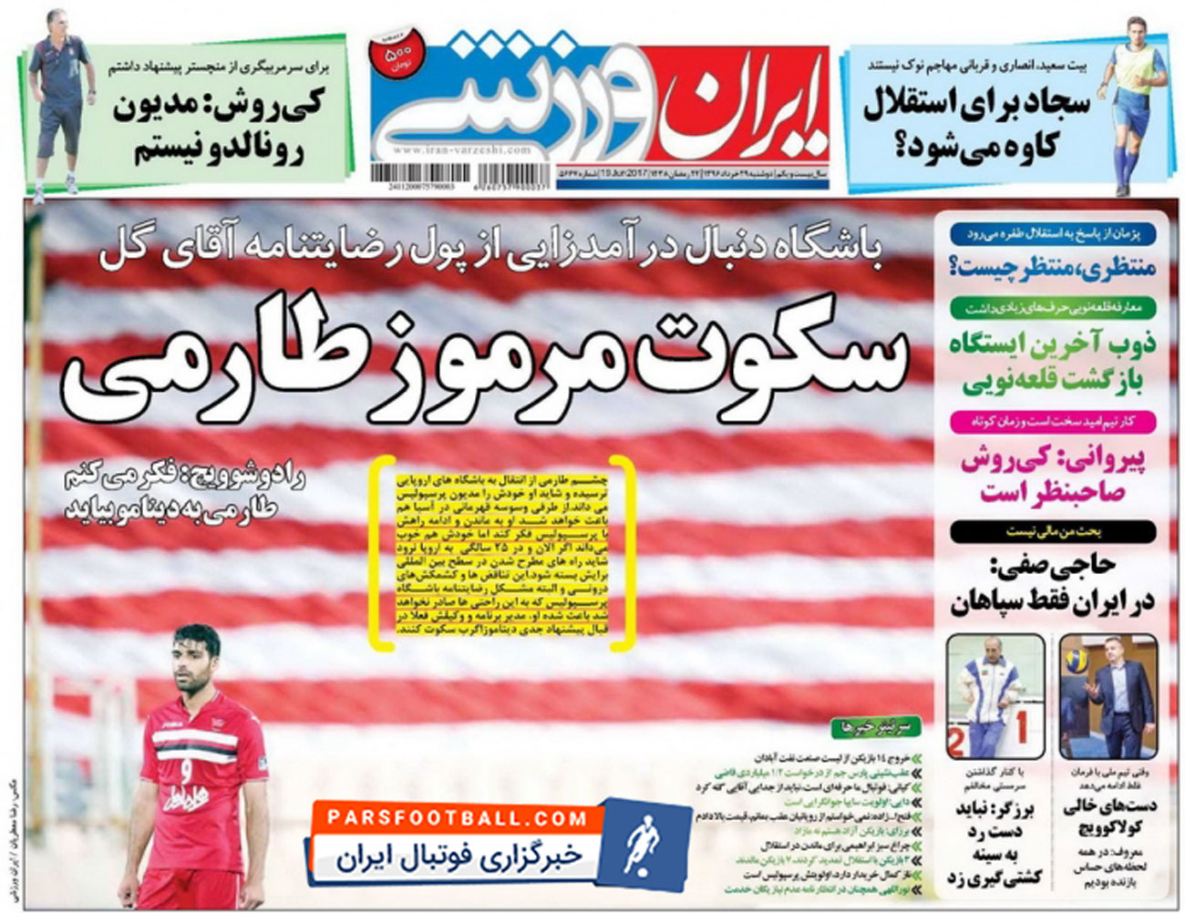 روزنامه ایران ورزشی ، دوشنبه ۲۹ خرداد ؛ سکوت مرموز طارمی !