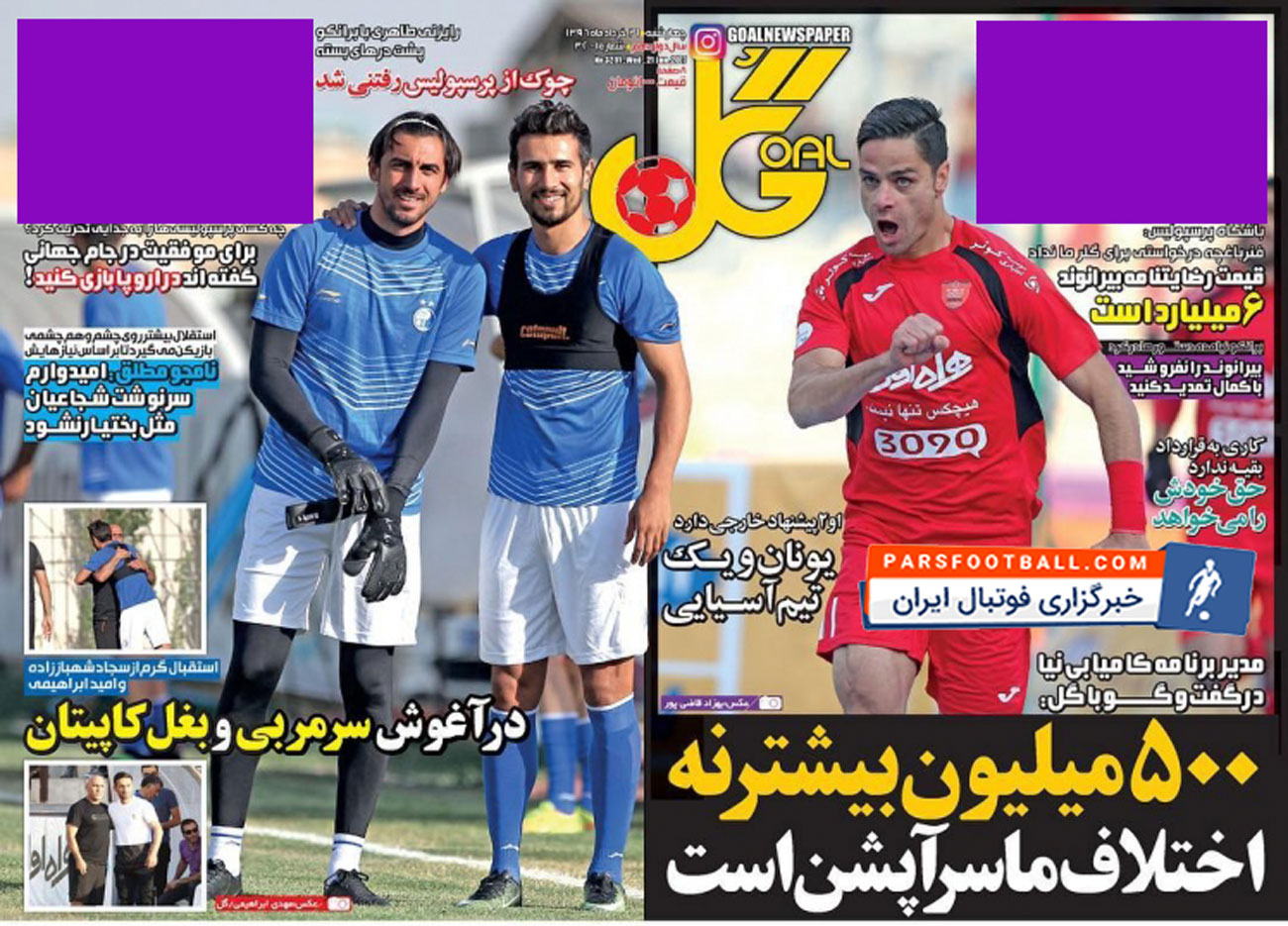 روزنامه گل ، چهارشنبه ۳۱ خرداد ؛ درآغوش سرمربی و بغل کاپیتان !