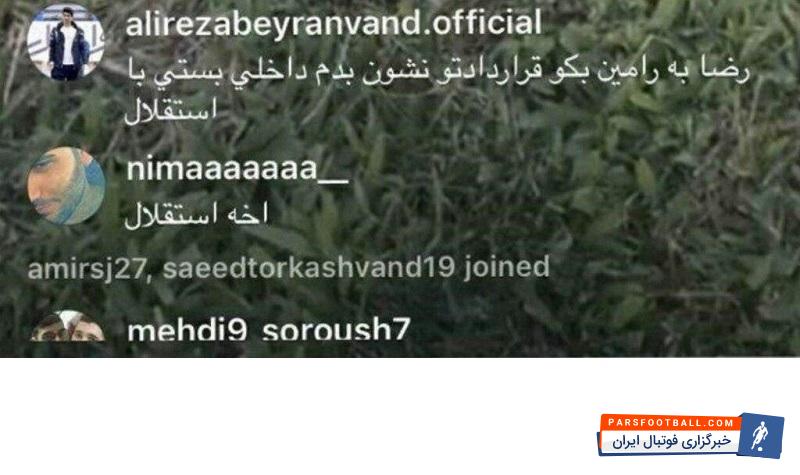 این روزها بحث پیوستن رامین رضاییان به استقلال بسیار داغ است و آبی های پایتخت به دنبال جذب مدافع سابق پرسپولیس هستند.علیرضا بیرانوند دروازه بان پرسپولیس در کامنت های استوری اینستاگرام با همبازی سابق خود شوخی کرد و نوشت که قرارداد داخلی رضاییان با استقلال را منتشر خواهد کرد.