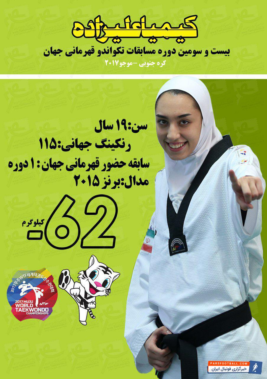 کیمیا علیزاده در وزن ۶۲- کیلوگرم به عنوان یکی از نمایندگان ایران در روز پایانی مسابقات قهرمانی جهان به مصاف حریفان خود میرود. بیست و سومین دوره مسابقات قهرمانی جهان ۲۰۱۷ با حضور ۹۷۳ تکواندوکار از ۱۸۳ کشور از روز شنبه (۳ تیرماه) در سالن «تیوان آرنا» موجو آغاز و (جمعه) ۹ تیر به پایان میرسد. در روز پایانی این مسابقات، رقابتهای اوزان ۶۲- کیلوگرم گروه زنان و ۸۰- کیلوگرم گروه مردان برگزار میشود.