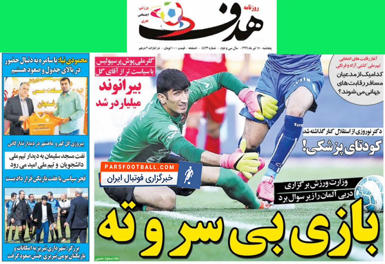 روزنامه هدف ، پنجشنبه ۱۵ تیر ؛ بیرانوند میلیاردر شد