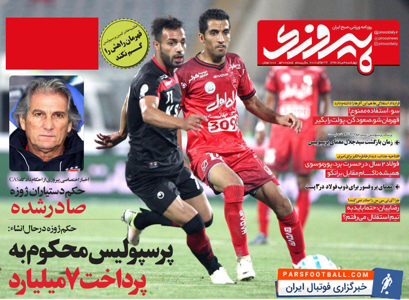 روزنامه پیروزی ، چهارشنبه ۴ مرداد ؛ حکم دستیاران ژوزه صادر شد !