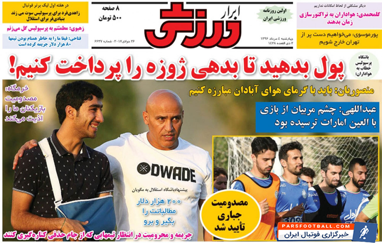 روزنامه ابرار ورزشی ، چهارشنبه ۴ مرداد ؛ مصدومیت جباری تایید شد !