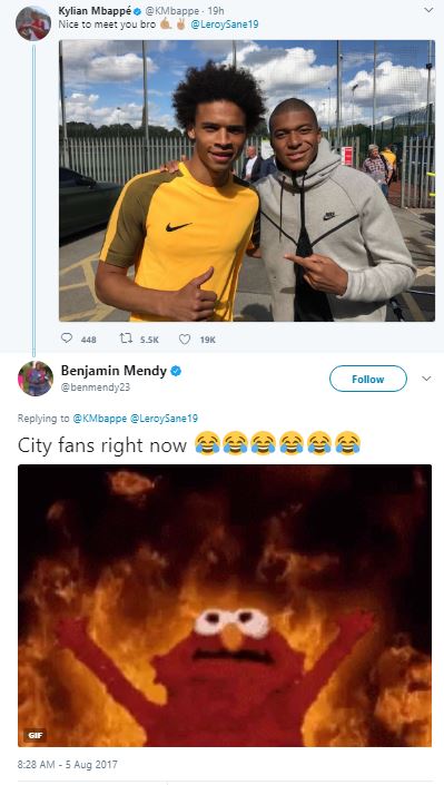 پس از آن بنجامین مندی هم تیمی سابق ام باپه نیز تنور شایعات را داغ تر کرد و در توئیترش با انتشار تصویری کارتونی و ربط دادن آن به هواداران سیتی، باعث پررنگ تر شدن شایعات در این سفر تبلیغاتی ام باپه شد.