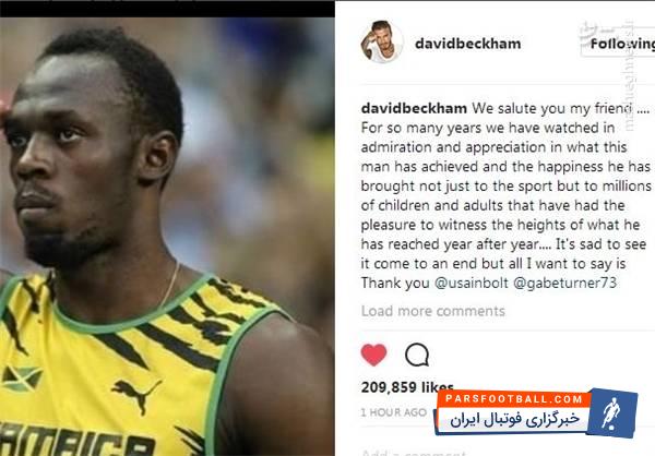 دیوید بکام پس از شوک جهانی دو و میدانی شب گذشته بابت دریافت مدال برنز در فینال توسط اوسین بولت به وی تبریک گفت و در اینستاگرام خود نوشت: