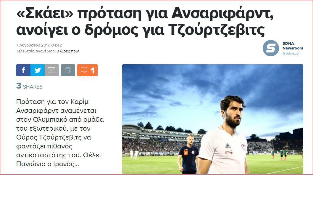 خبرگزاری SDNA یونان در ادامه گزارش های خود پیرامون انصاری فرد در المپیاکوس مدعی شد قهرمان یونان با قطعی کردن تصمیم خود برای کنار گذاشتن مهاجم ایرانی از فهرست نفرات برای فصل آتی جانشین کریم را انتخاب و با مهاجم باشگاه پارتیزان برای امضای قراردادی سه ساله به توافق رسیده است.