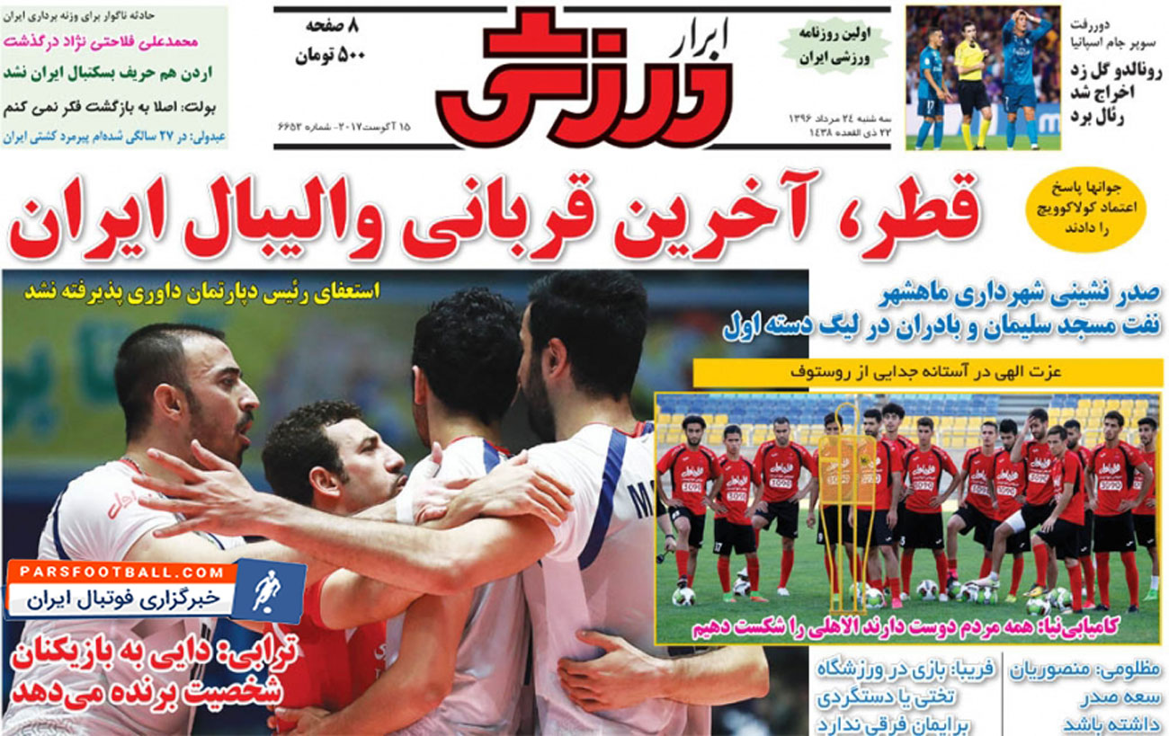 روزنامه ابرار ورزشی ، سهشنبه ۲۴ مرداد ؛ قطر آخرین قربانی والیبال ایران