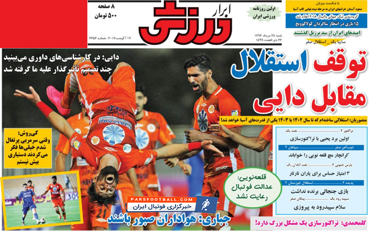 روزنامه ابرار ورزشی ، شنبه ۲۸ مرداد ؛ جباری : هواداران صبور باشند !