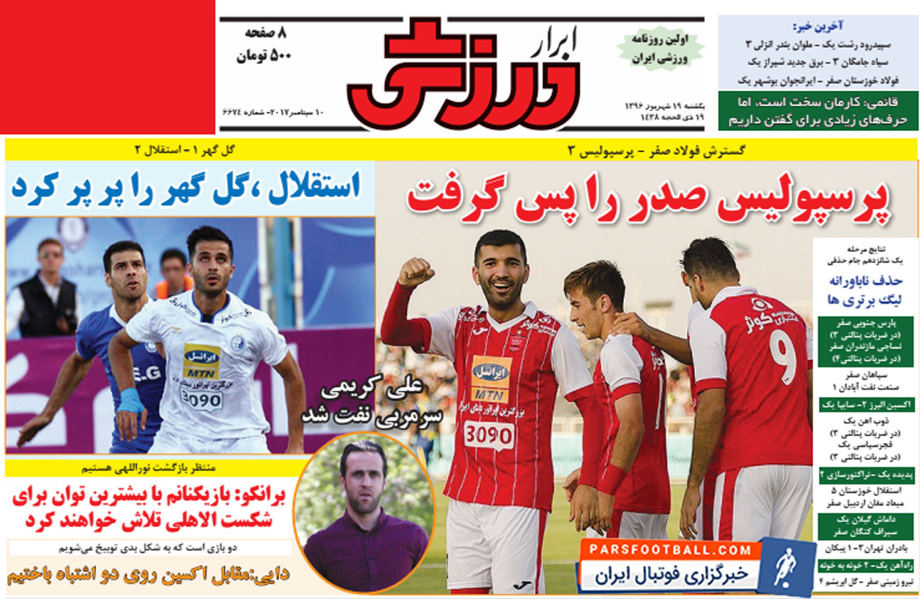 روزنامه ابرار ورزشی ، یکشنبه ۱۹ شهریور ؛ پرسپولیس صدر را پس گرفت !