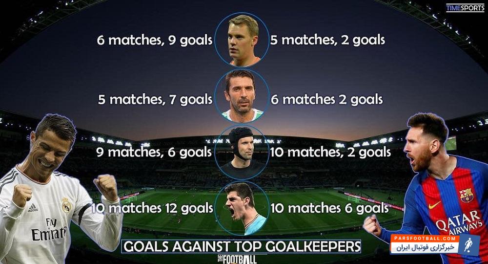 مقایسه آمار گلزنی مسی و رونالدو در برابر دروازه بانان مطرح دنیا نشان می دهد که کفه ترازو به سمت ستاره پرتغالی به طرز کاملا محسوسی سنگینی می کند .