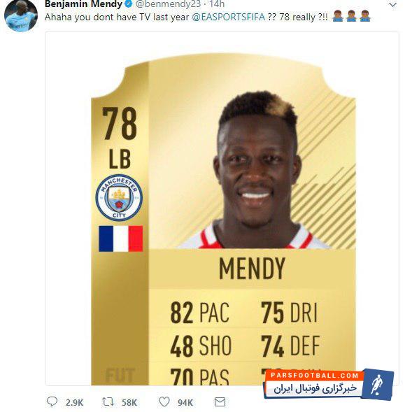 بنجامین مندی، دفاع چپ فرانسوی تیم فوتبال منچسترسیتی از نمره خود در بازی فیفا ۱۸، چندان راضی به نظر نمیرسد و به ان واکنش نشان داد