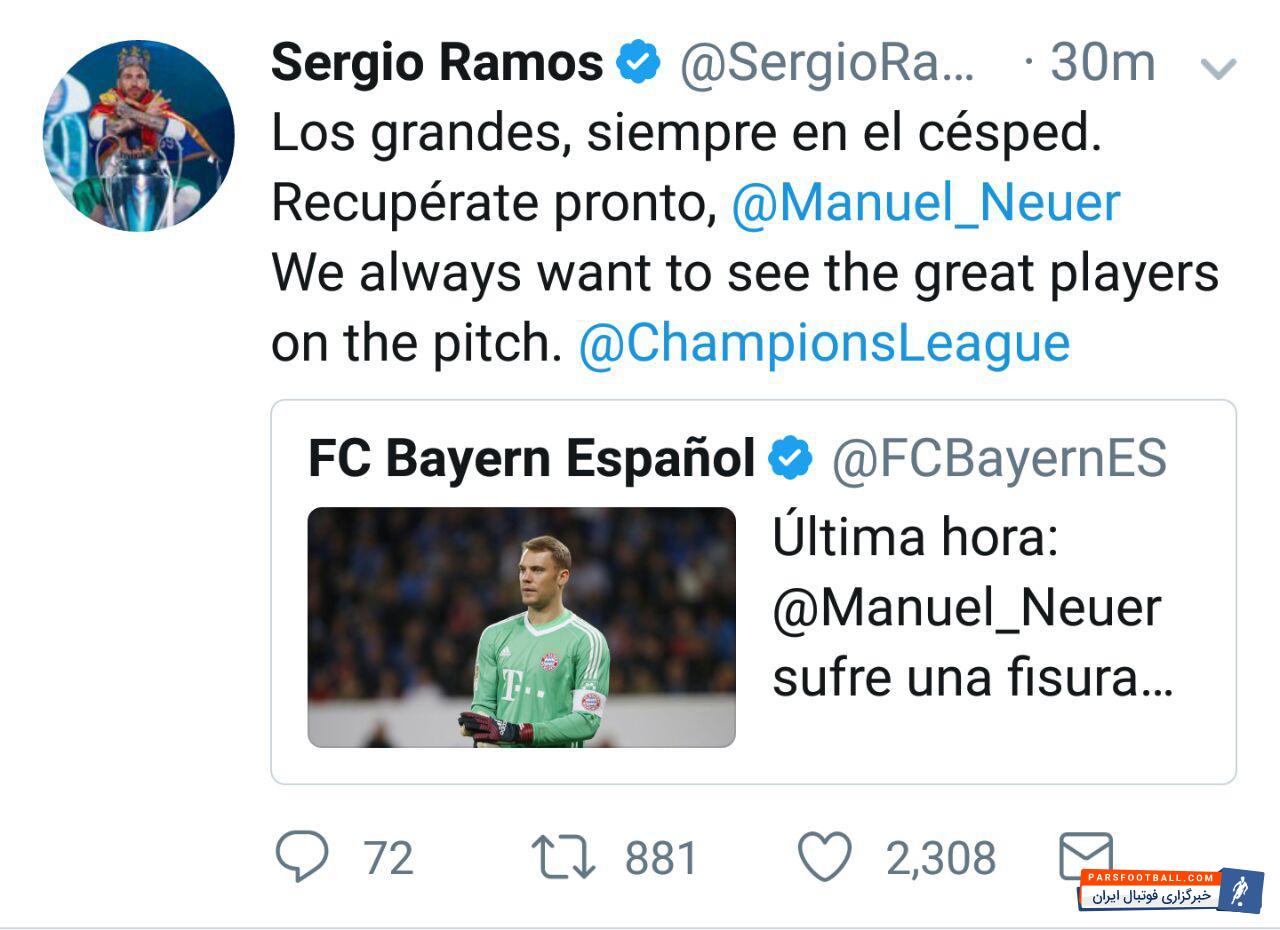 کاپیتان تیم رئال مادرید در توییتر به مصدومیت کاپیتان باوارایی ها واکنش نشان داد و در این باره نوشت: