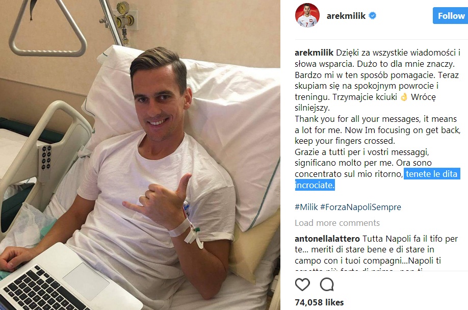 آرکادیوش میلیک ، مهاجم ناپولی دوباره از ناحیه رباط صلیبی دچار مصدومیت شده است و حداقل ۴ ماه از میادین به دور خواهد بود. وی در پیامی از همه کسانی که به یاد او بودند، تشکر کرده است.