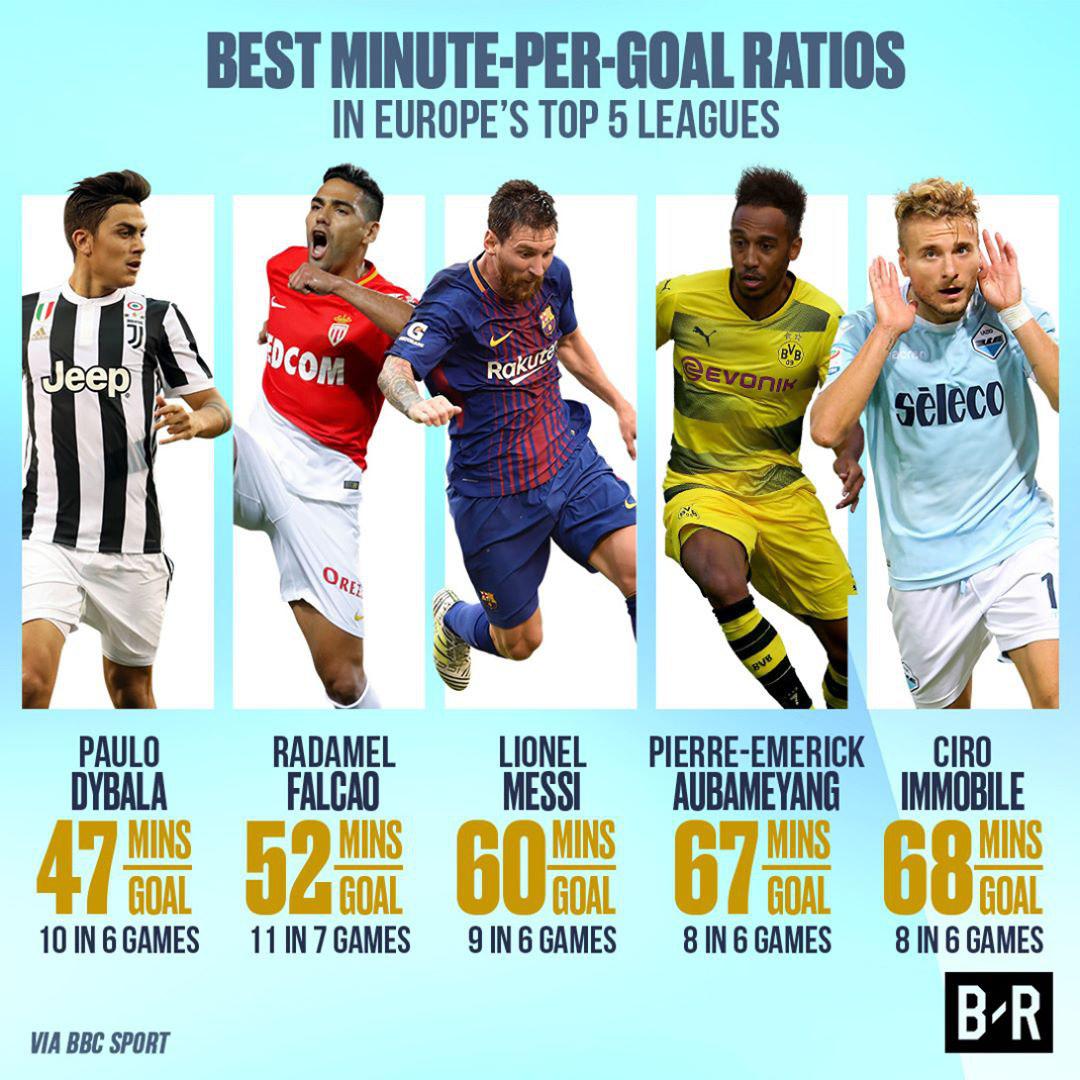 به گزارش بی بی سی اسپورت، پائولو دیبالا با آمار باورنکردنی یک گل، در هر ۴۷ دقیقه (۱۰ گل در شش بازی) بهترین مهاجم اروپا در این زمینه محسوب می شود. رادامل فالکائو، مهاجم موناکو با ۱۱ گل، در ۷ بازی و آمار یک گل، در هر ۵۲ دقیقه، جایگاه دوم را در اختیار دارد. بعد از این دو بازیکن، لیونل مسی از بارسلونا با ۹ گل، در ۶ بازی قرار دارد و رده های بعدی را نیز پیر امریک اوبامیانگ با ۸ گل، در ۶ بازی و چیرو ایموبیله با آماری مشابه اوبامیانگ در اختیار دارند. تنها فرق بین آمار گلزنی ایموبیله و اوبامیانگ، دقایق بازی آن ها است.