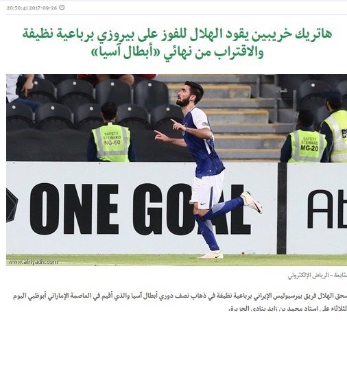 روزنامه الریاض نوشت: هتتریک خریبین باعث شکست پرسپولیس و نزدیکشدن تیم الهلال به فینال لیگ قهرمانان آسیا شد. ۱۱ هزار و ۳۲۱ تماشاگر در ورزشگاه محمد بن زاید ابوظبی حضور داشتند و دیدار برگشت در مسقط برگزار خواهد شد.