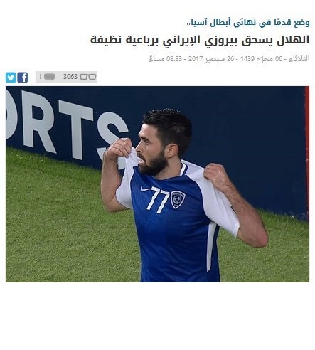 سایت عاجل عربستان نیز با تمجید از مهاجم سوری تیم الهلال نوشته است: الهلال با شکست پرسپولیس در یک قدمی فینال لیگ قهرمانان آسیا قرار گرفت. الهلال که با حمایت گسترده اماراتیها در ورزشگاه محمد بن زاید ابوظبی به میدان رفته بود با ۴ گل از سد پرسپولیس گذشت.