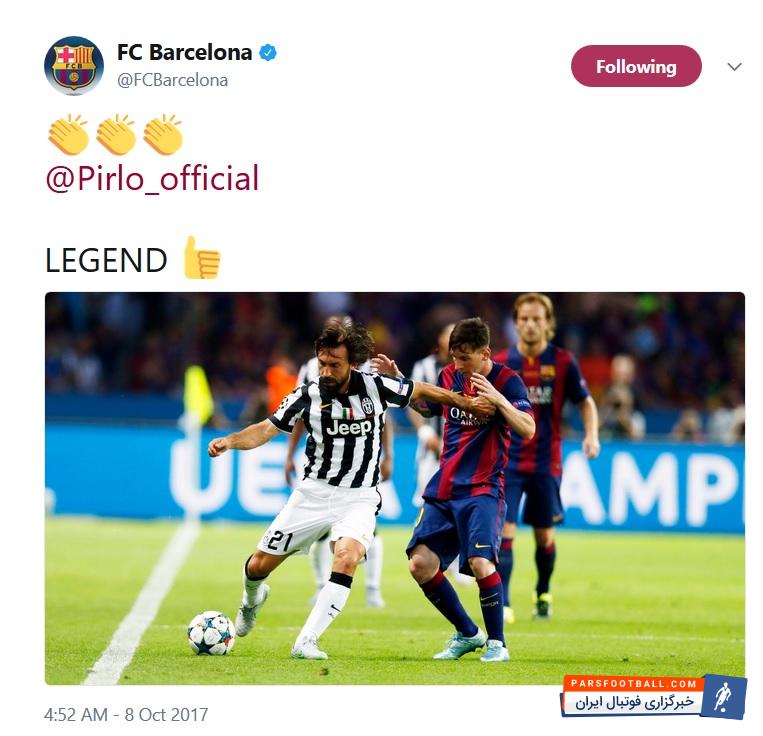 توئیتر رسمی باشگاه بارسلونا به خبر خداحافظی پیرلو از فوتبال واکنش داد و نوشت: