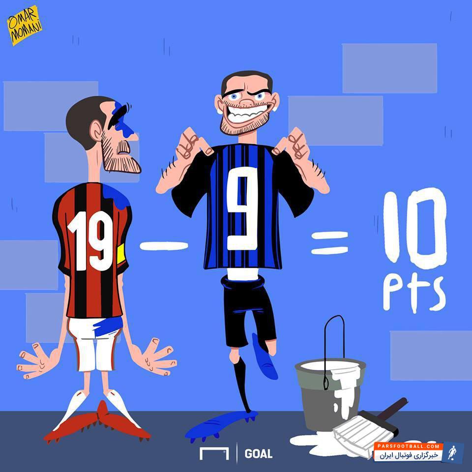 شب گذشته اینتر موفق شد با هت تریک مائورو ایکاردی ، با نتیجه ۳-۲ میلان را شکست دهد. در حال حاضر اختلاف دو تیم در جدول سری آ ایتالیا ۱۰ امتیاز است. اینتر با ۷ پیروزی و یک تساوی از ۸ دیدار این فصل خود، بعد از ناپولی ۲۴ امتیازی با ۲۲ امتیاز در رده دوم جدول حضور دارد. عمر مومنی با این کاریکاتور به اختلاف امتیاز دو تیم اشاره دارد.