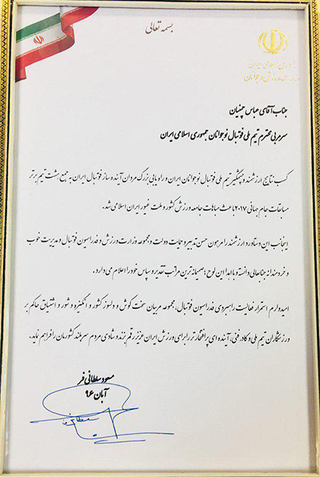 به نقل از سایت رسمی فدراسیون فوتبال، مسعود سلطانیفر ، وزیر ورزش و جوانان در شورای معاونان وزارت ورزش با اهدا لوح تقدیر از خدمات و تلاشهای عباس چمنیان سرمربی تیم فوتبال نوجوانان ایران تقدیر کرد.