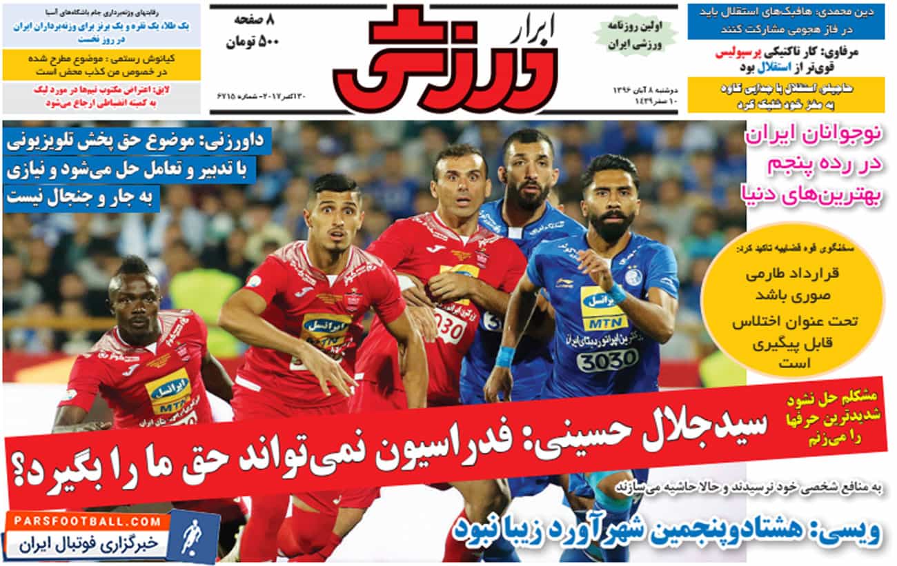 روزنامه ابرار ورزشی ، دوشنبه ۸ آبان ؛ دربی ۸۵ زیبا نبود !