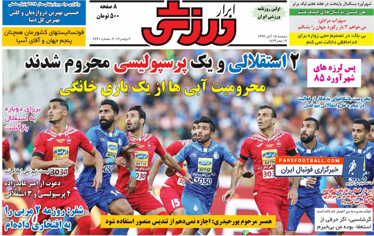 روزنامه ابرار ورزشی ، دوشنبه ۱۵ آبان ؛ محرومیت آبی ها از یک بازی خانگی !