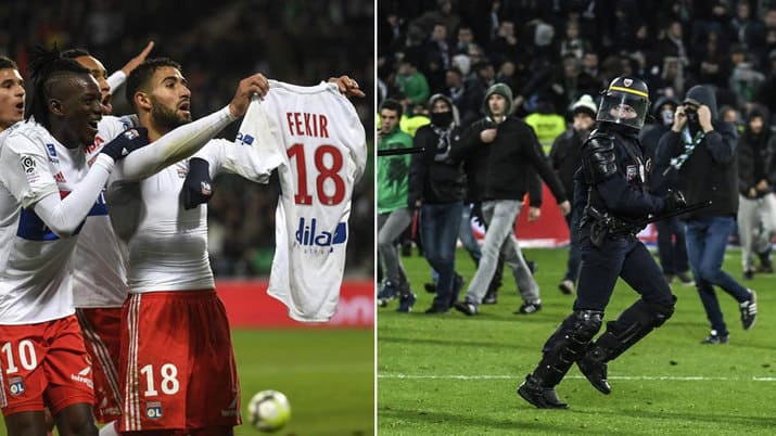 علت هجوم هواداران سنت اتین به زمین به شادی گل جنجالی نبیل فکیر ارتباط داشت. فکیر پس از زدن گل پنجم لیون، با بیرون آوردن پیراهنش و نشان دادن آن به هواداران سنت اتین باعث تحریک آنها شد؛ شادی گلی به سبک شادی گل مسی در ال کلاسیکوی چند ماه پیش.