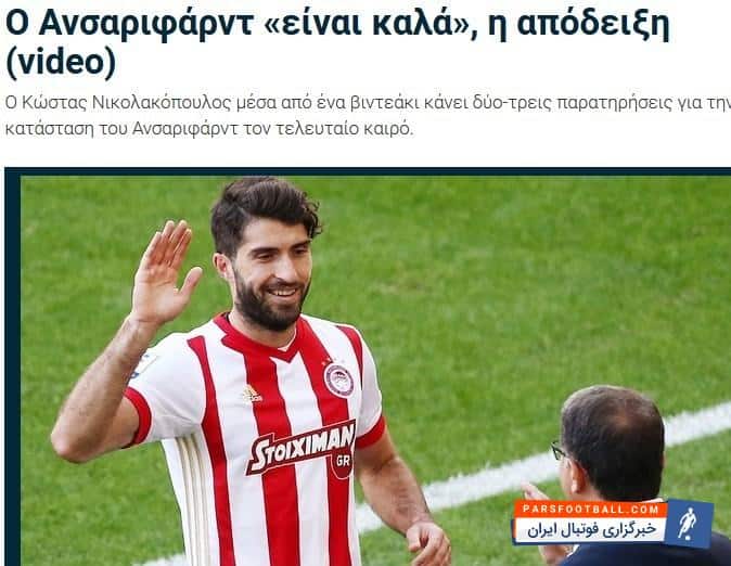 این رسانه یونانی در ادامه با اشاره به کریم انصاری‌فرد آورده است: در چنین شرایطی وضعیت کریم انصاری‌فرد برای تیم المپیاکوس بسیار مهم است. به نظر می‌رسد او در بعضی از بازی‌ها خوب است و به غیر از بازی دربی برابر پائوک که واقعا خوب نبود در سایر بازی‌ها به تیم المپیاکوس کمک کرد و نزدیک به گلزنی قرار داشت. کریم مشارکت خوبی در کارهای گروهی دارد. در مناطق مختلف زمین خوب حرکت می‌کند و به طور کلی تاثیز مثبتی روی بازی دارد.