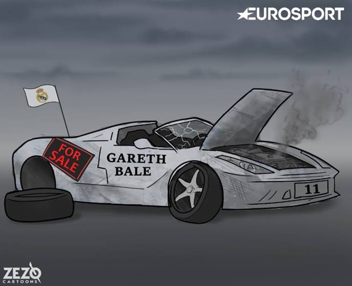 گرت بیل ستاره ولزی رئال مادرید بازهم مصدوم شد تا تعداد مصدومیت های او بسیار زیاد شود. زیزو الیزیدی، کاریکاتوریست مشهور یورو اسپورت در جدیدترین اثر خود به این موضوع پرداخته و بیل را همچون ماشینی داغون که برای فروش گذاشته شده، ترسیم کرده است.