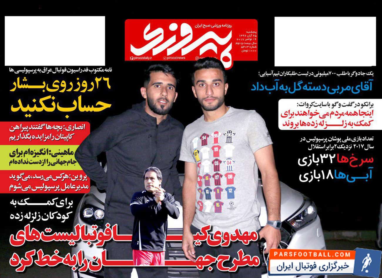 عناوین روزنامه پیروزی در روز پنجشنبه ۲۵ آبان به شرح زیر است :