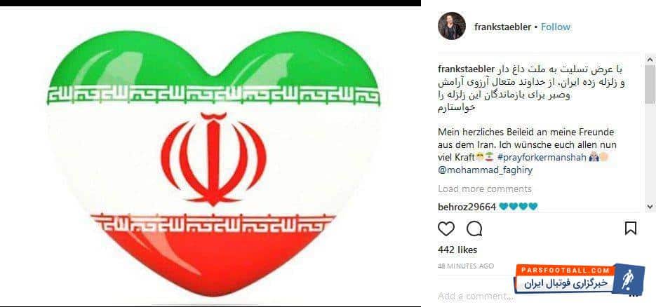 پس از جردن باروز، فرانک استابلر قهرمان آلمانی کشتی فرنگی جهان، با انتشار پستی به زبان فارسی در صفحه اینستاگرامش، به بازماندگان زلزله کرمانشاه تسلیت گفت.