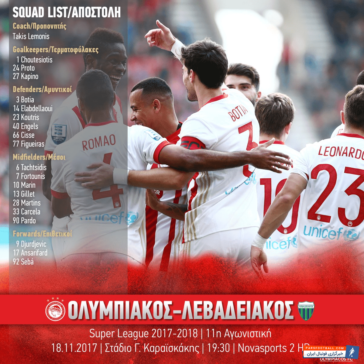 تیم فوتبال المپیاکوس امشب از ساعت ۲۱ در هفته یازدهم سوپر لیگ یونان مقابل لوایاکوس صف آرایی میکند در این راستا لیست ۱۹ بازیکنش را برای این دیدار اعلام کرد.