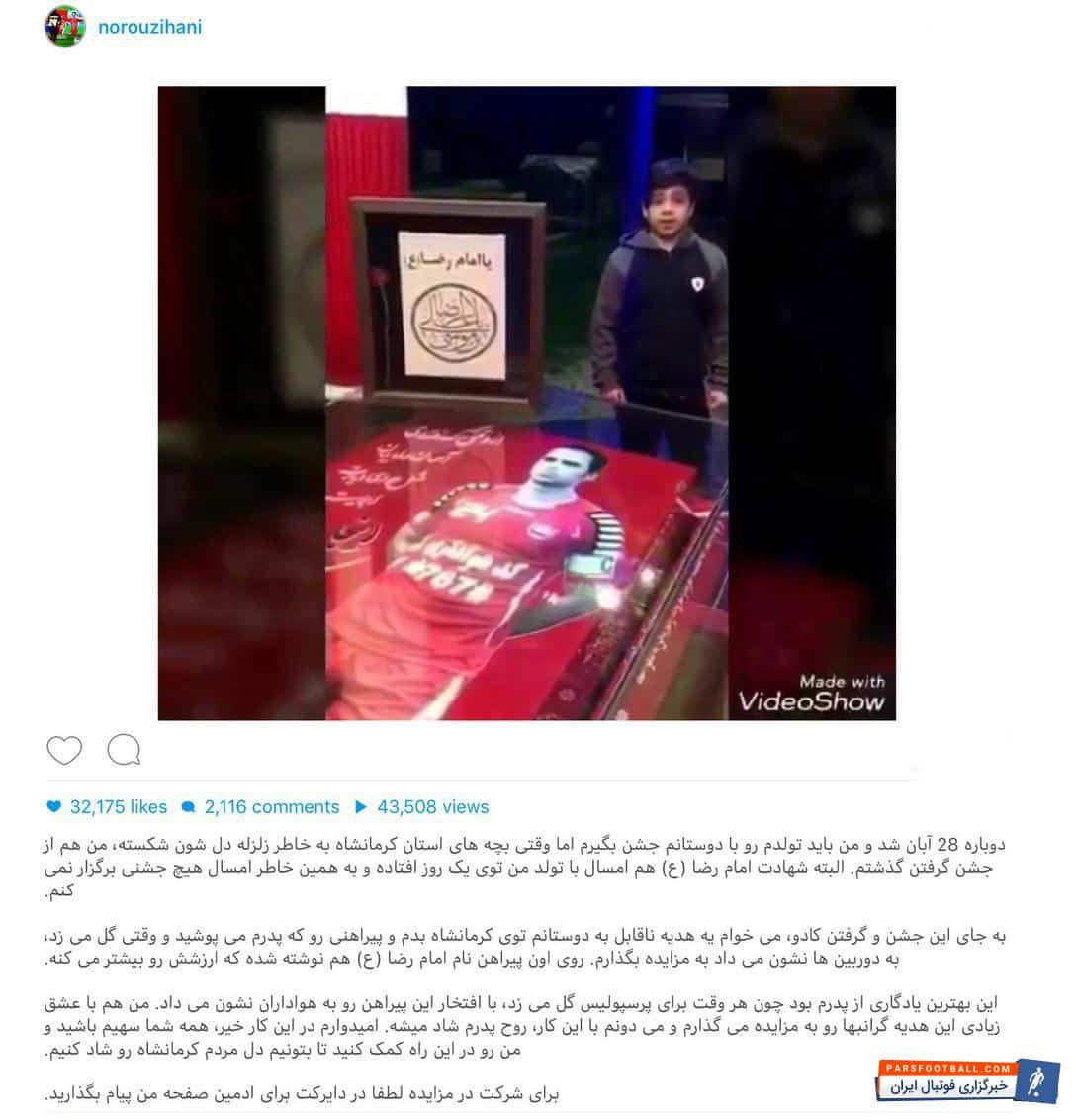 به جای این جشن و گرفتن کادو، می خوام یه هدیه بزرگ به دوستانم توی کرمانشاه بدم و پیراهنی رو که پدرم می پوشید و وقتی گل می زد، به دوربین ها نشون می داد به مزایده بگذارم. روی اون پیراهن نام امام رضا (ع) هم نوشته شده که ارزشش رو بیشتر می کنه. این بهترین یادگاری از پدرم بود چون هر وقت برای پرسپولیس گل می زد، با افتخار این پیراهن رو به هواداران نشون می داد. من هم با عشق زیادی این هدیه گرانبها رو به مزایده می گذارم و می دونم با این کار، روح پدرم شاد میشه. امیدوارم در این کار خیر، همه شما سهیم باشید و من رو در این راه کمک کنید تا بتونیم دل مردم کرمانشاه رو شاد کنیم.