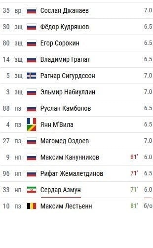 خبرگزاری ورزشی چمپیونات روسیه با مشارکت کاربرانش در ارزیابی فنی عملکرد بازیکنان ۲ تیم آرسنال روسیه و روبینکازان به سردار آزمون نمره فنی متوسط ۶ را اختصاص داد.
