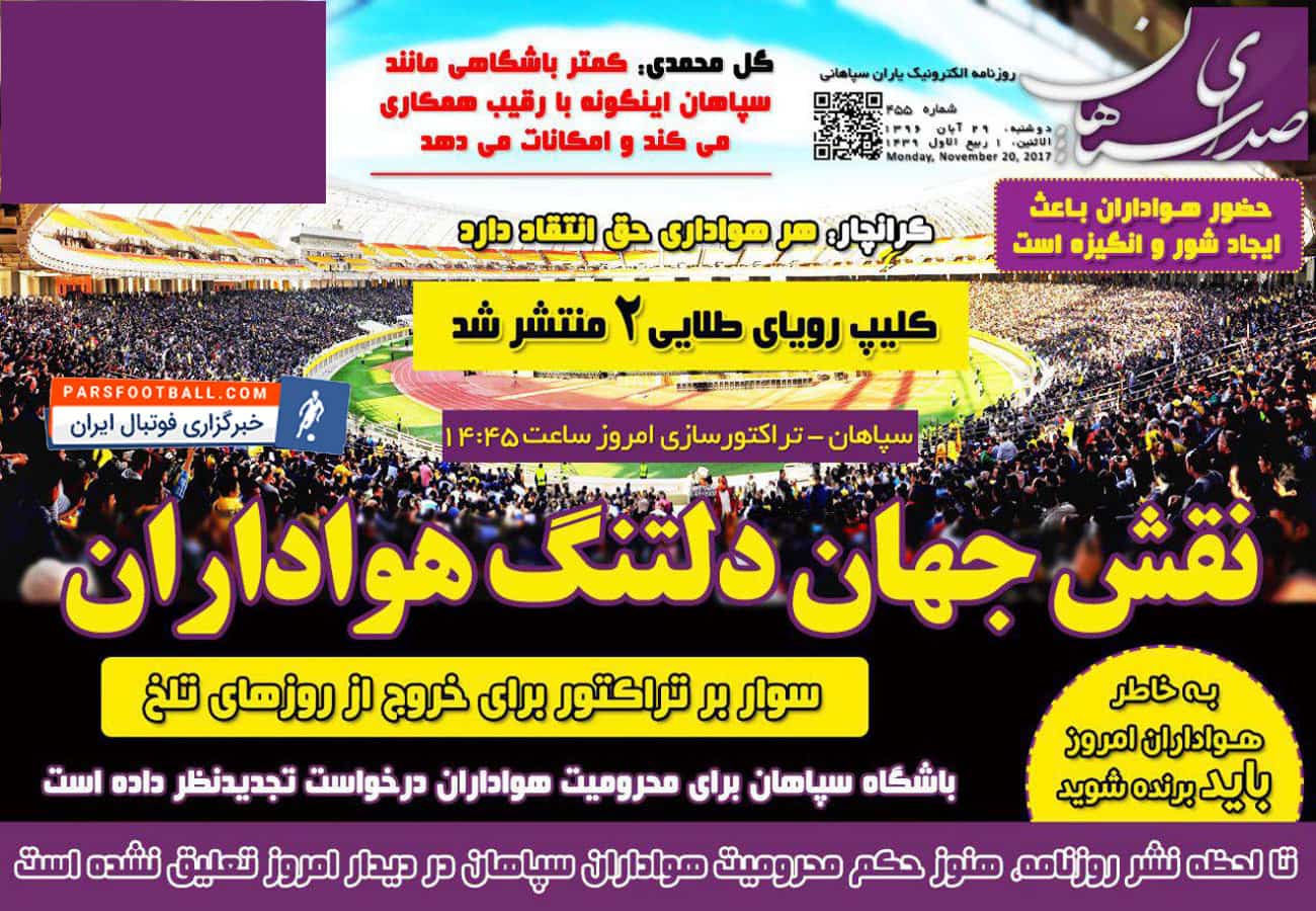 روزنامه صدای سپاهان ، دوشنبه ۲۹ آبان ؛ نقش جهان دلتنگ هواداران !