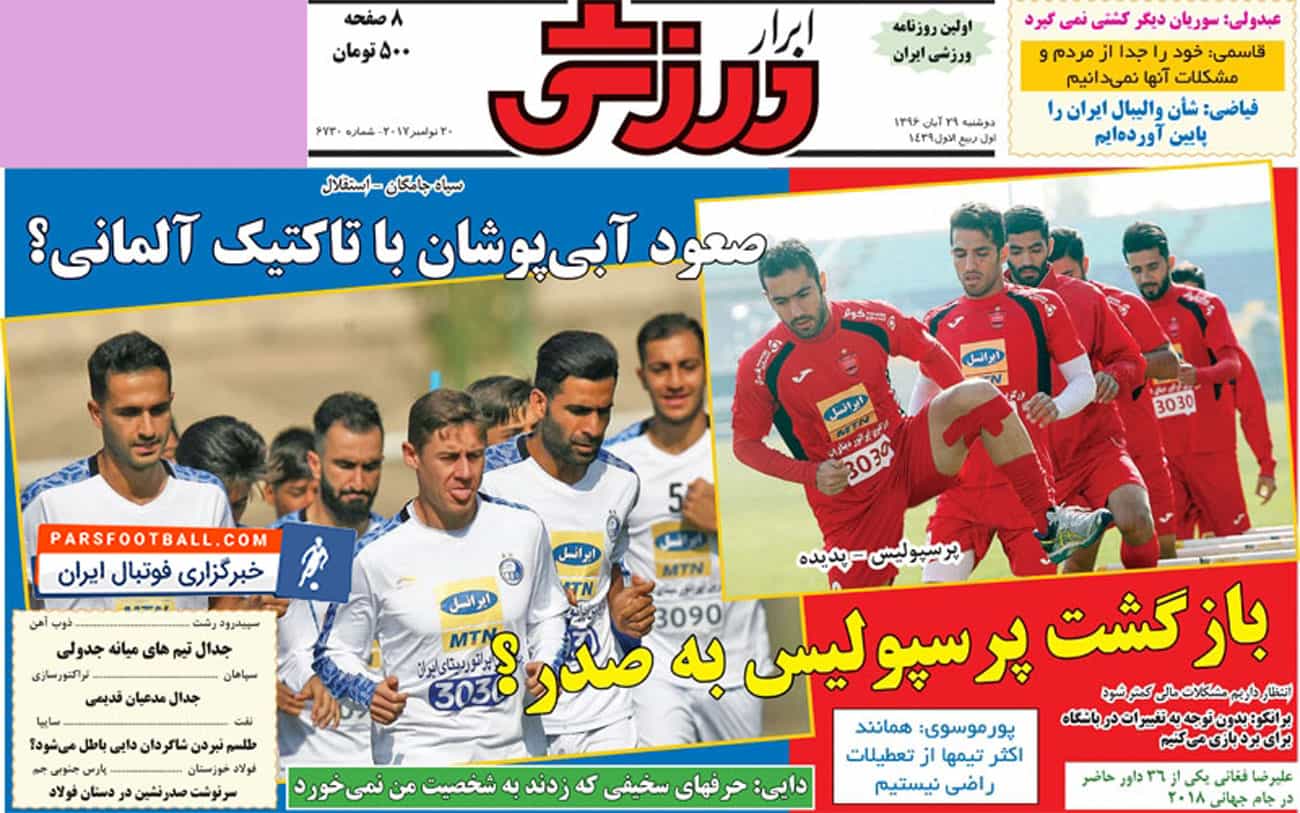 روزنامه ابرار ورزشی ، دوشنبه ۲۹ آبان ؛ صعود آبی پوشان با تاکتیک آلمانی ؟