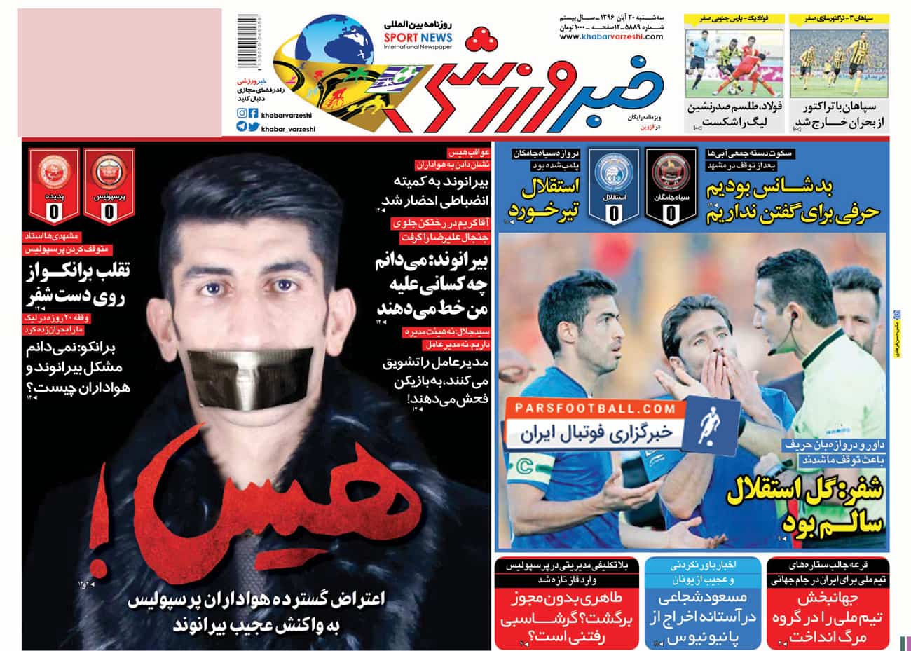 روزنامه خبر ورزشی ، سهشنبه ۳۰ آبان ؛ هیس !