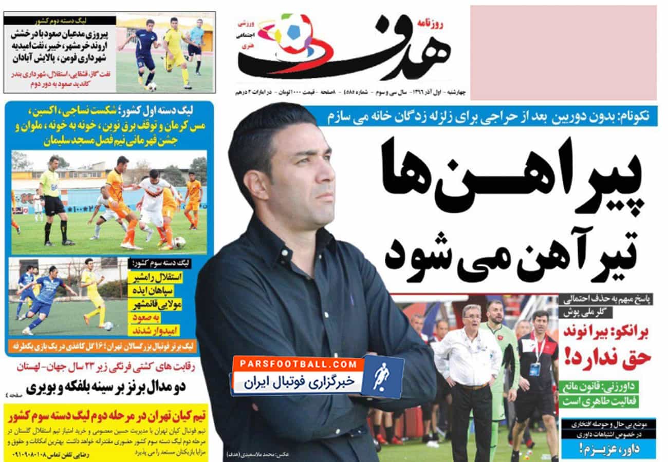 روزنامه هدف ورزشی ، چهارشنبه ۱ آذر ؛ برانکو : بیرانوند حق ندارد !
