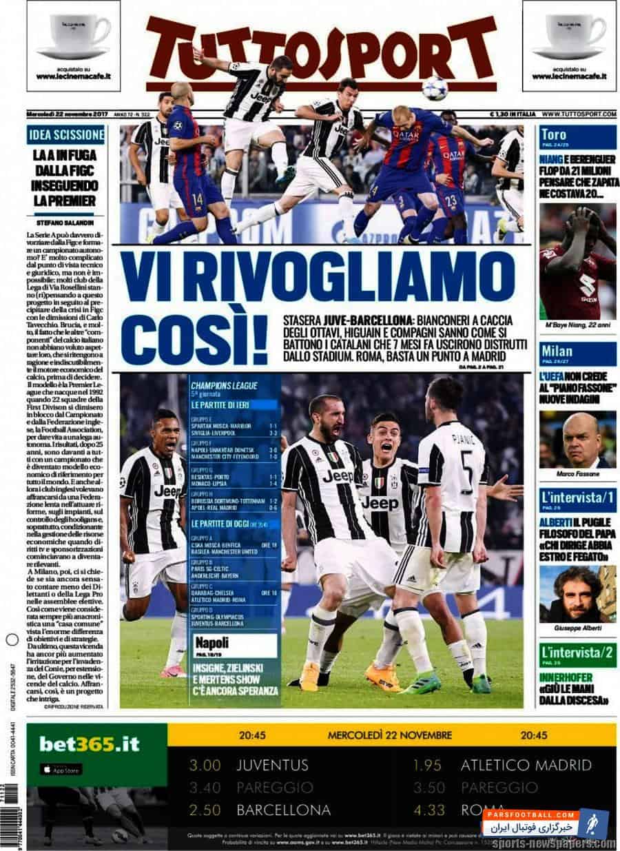 تیتر های نشریهی توتو اسپورت در روز چهارشنبه ۲۲ نوامبر به این شرح است :
