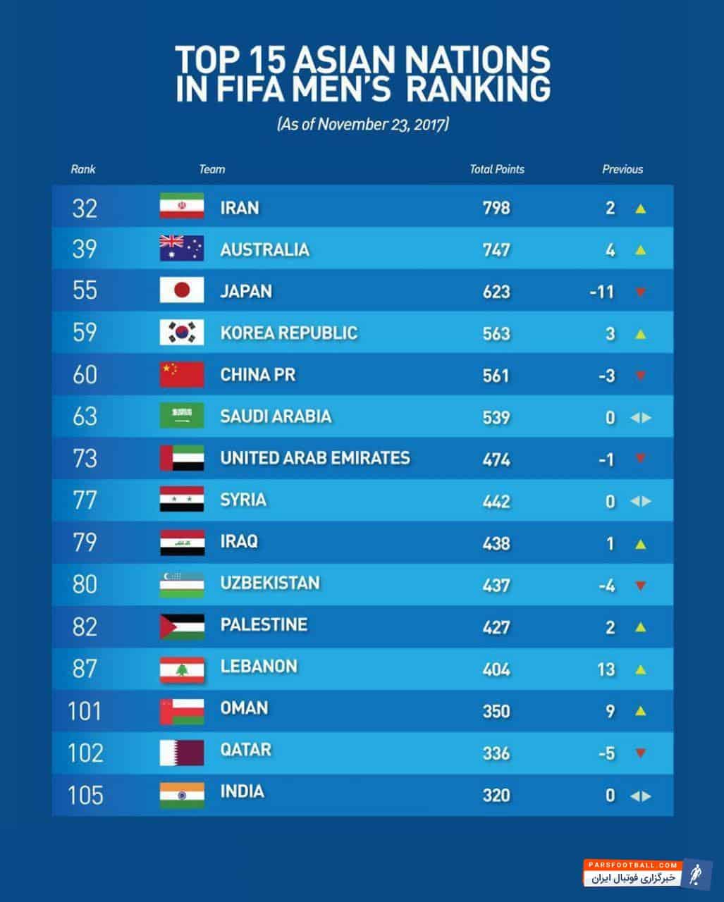 در ادامه شما را به دیدن ترتیب تیم های منتخب آسیا از دید فیفا دعوت می کنیم :
