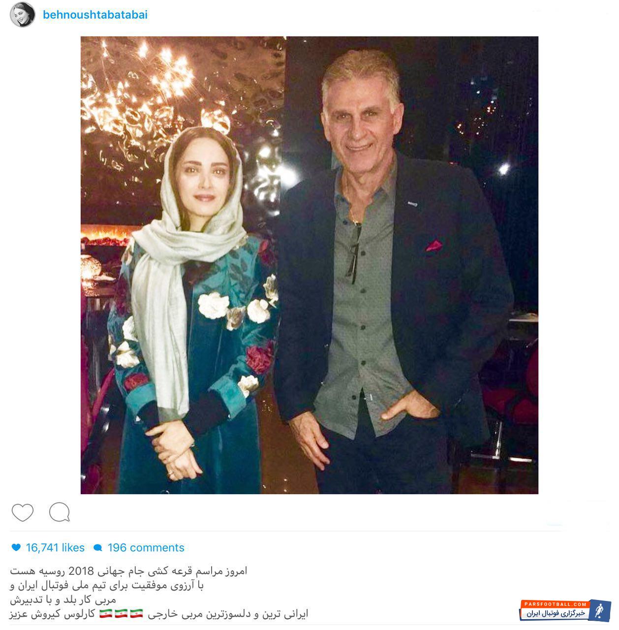 بهنوش طباطبایی بازیگر مطرح سینمای ایران با انتشار یک تصویر در کنار کی روش به بهانه قرعه کشی جام جهانی برای تیم ملی آرزوی موفقیت کرده است.