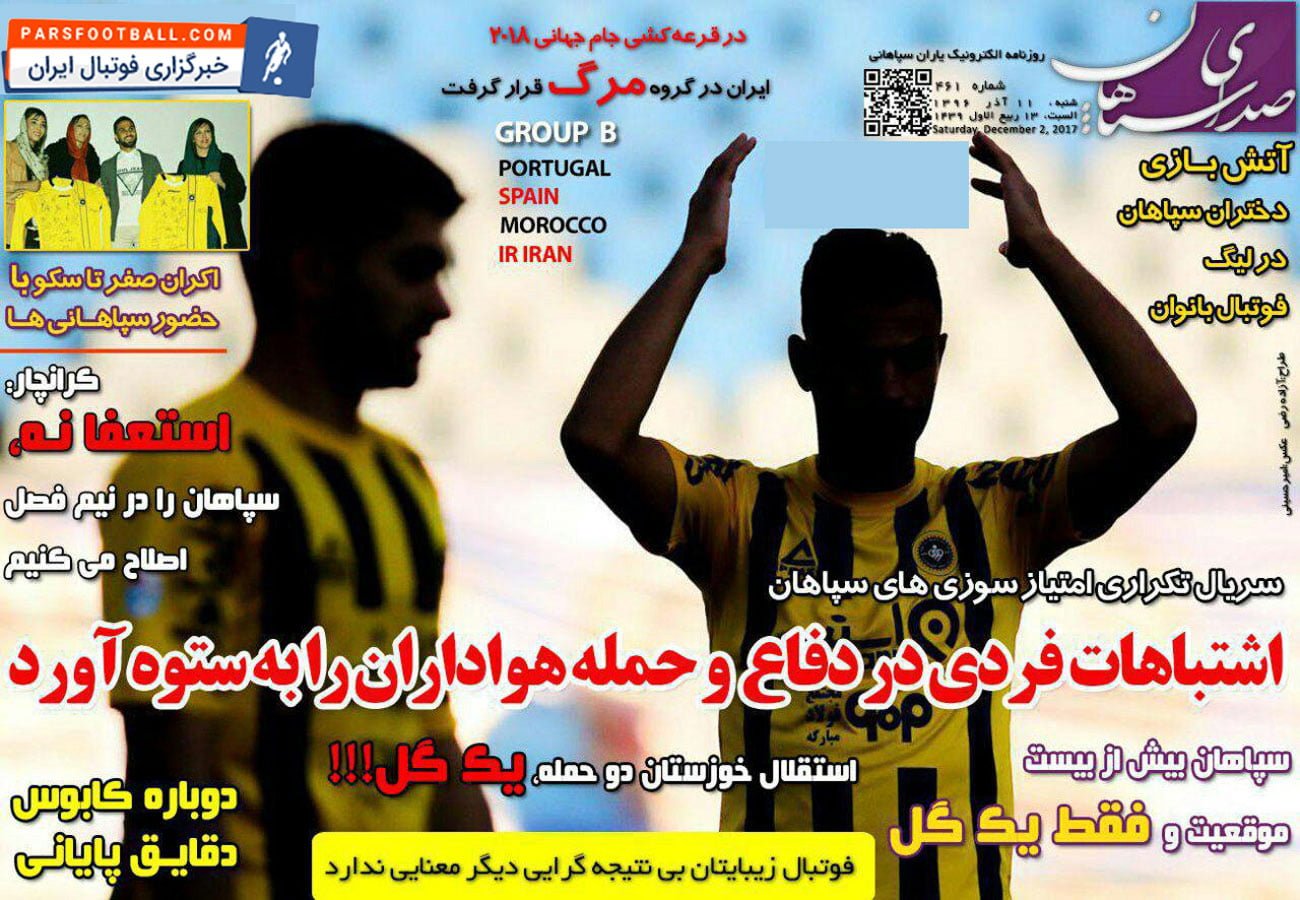 عناوین روزنامه صدای سپاهان در روز شنبه ۱۱ آذر به شرح زیر است :