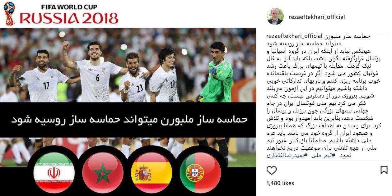 سید رضا افتخاری مدیرعامل استقلال با انتشار پیامی در صفحه رسمی خود در اینستاگرام به قرعه ایران در جام جهانی واکنش نشان داد. مدیرعامل استقلال نوشت: