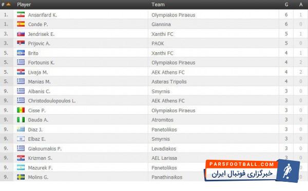 کریم انصاری فرد با دو گلی که برابر آپولون به ثمر رساند صدرنشین جدول گلزنان لیگ یونان شد.