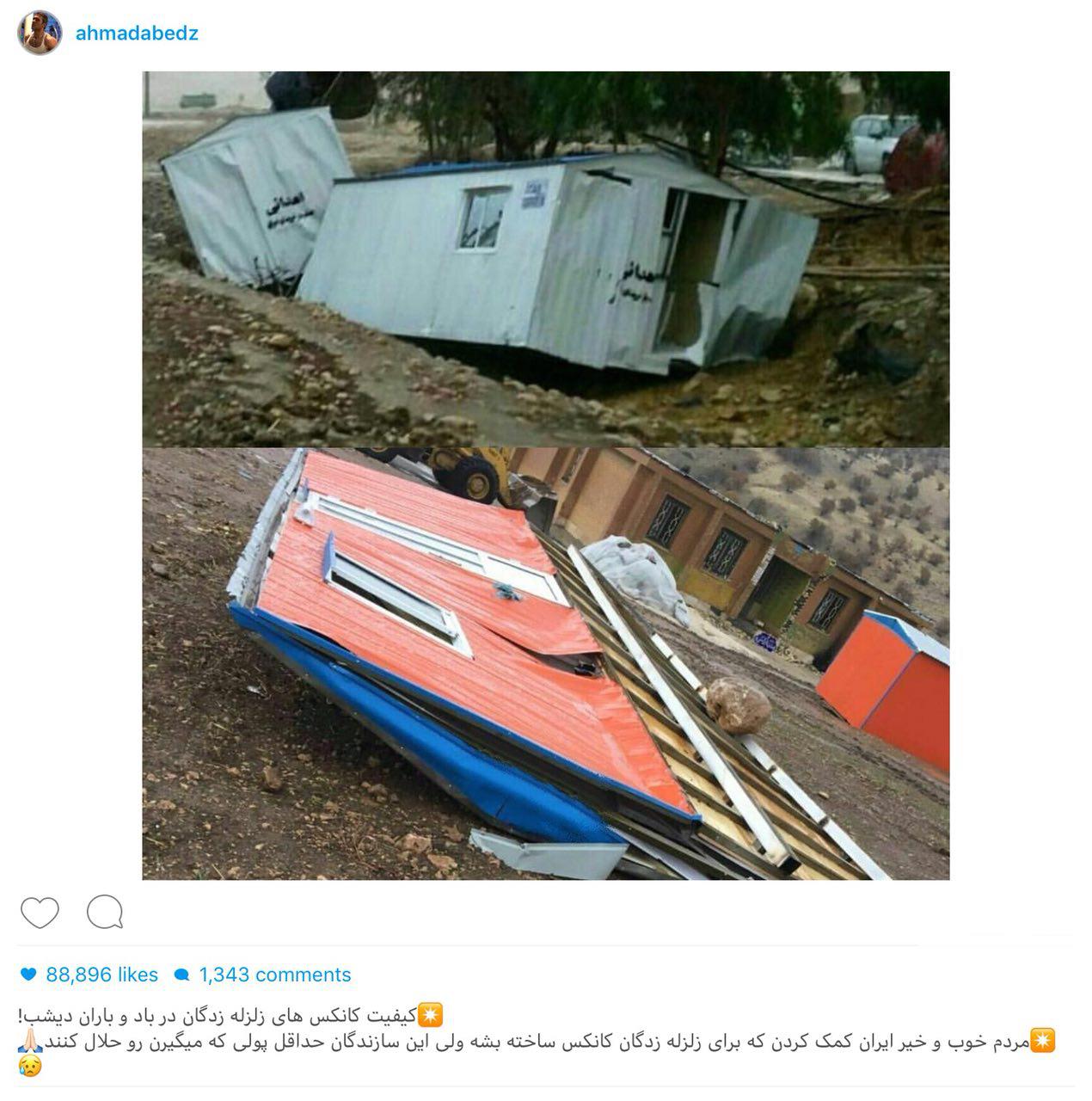 احمدرضا عابدزاده دروازه‌بان سابق تیم ملی فوتبال کشورمان با انتشار تصویری در صفحه اینستاگرام خود از برخی کانکس هایی که به زلزله زدگان تحویل داده شده است، انتقاد کرد.