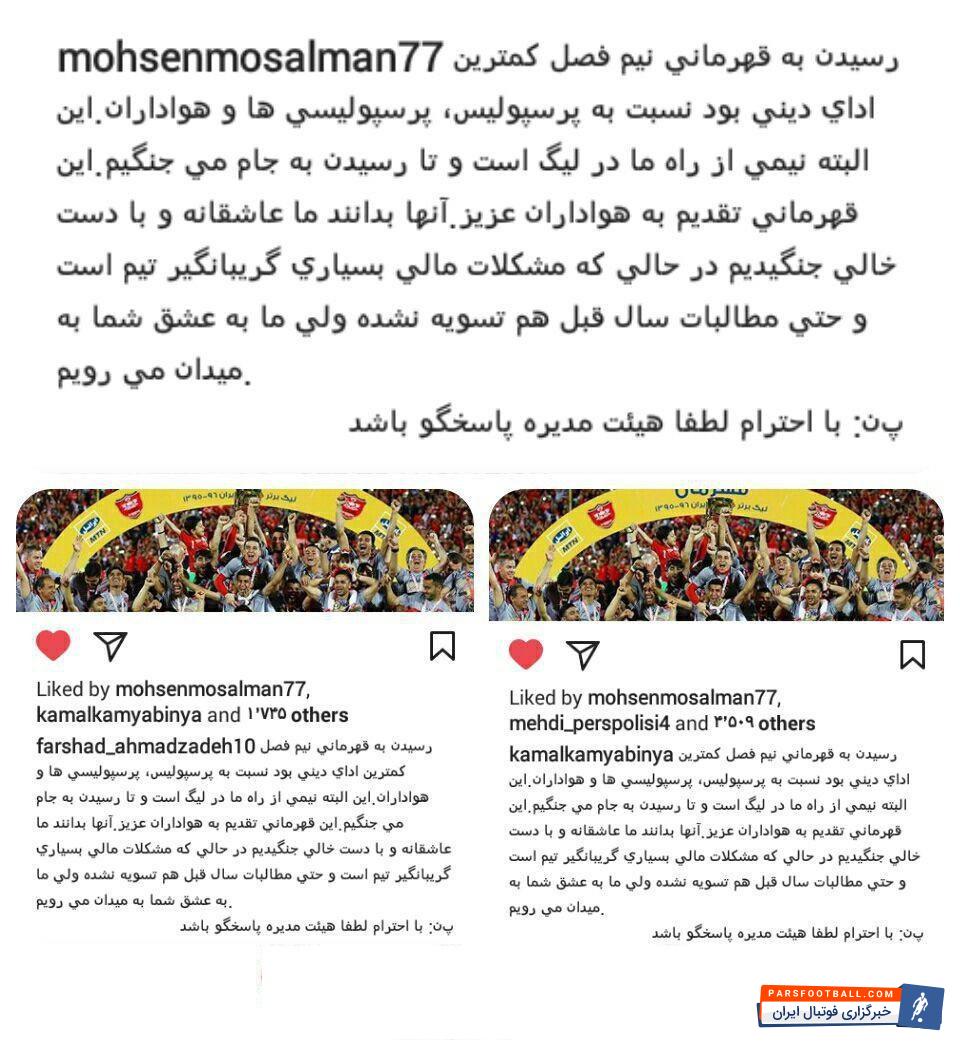 بازیکنان تیم پرسپولیس پس از قهرمانی در نیم فصل و پیروزی مقابل صنعت نفت آبادان، در صفحه اینستاگرام خود، به هیئت مدیره تیم پرسپولیس اخطار دادند.