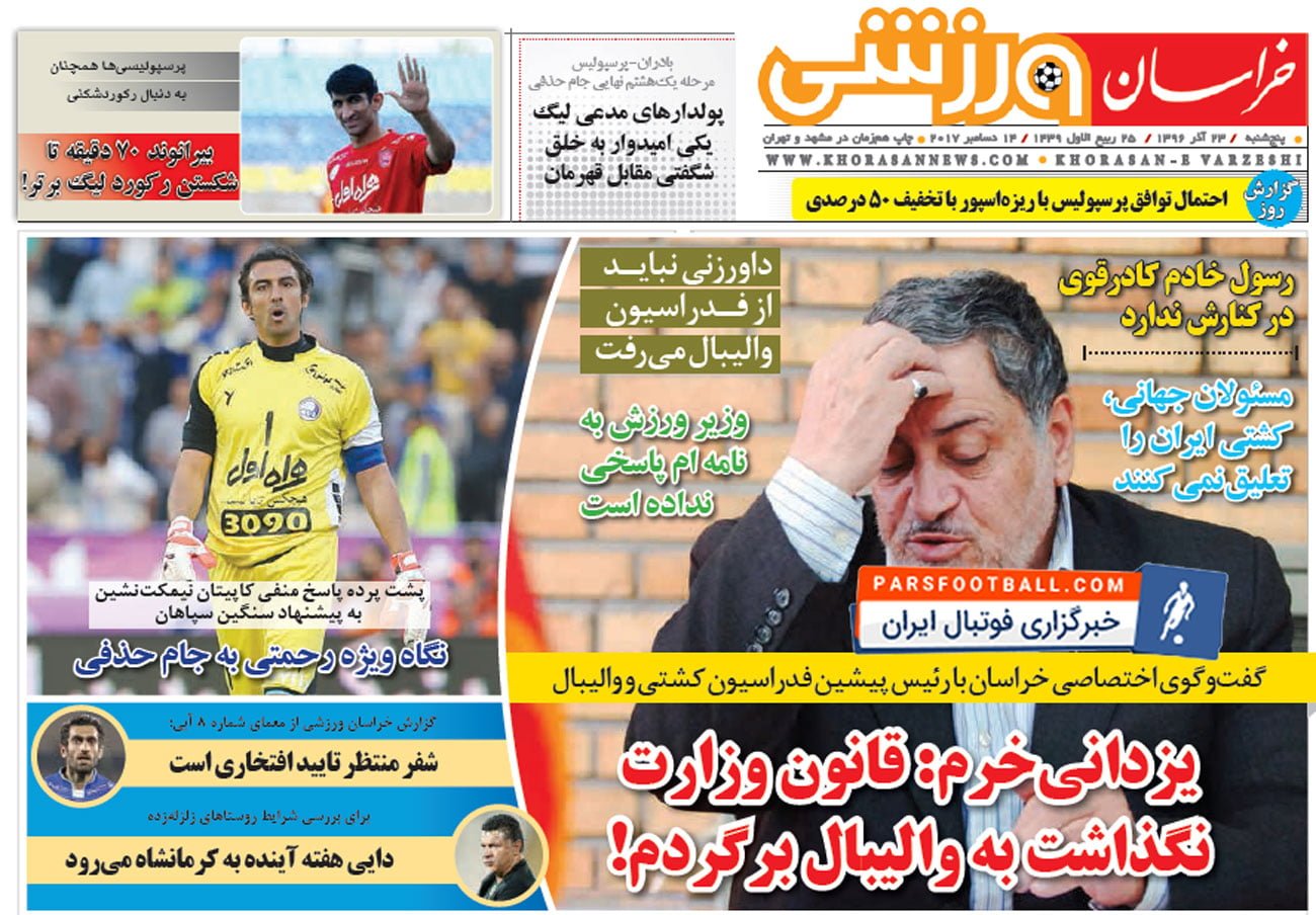 عناوین روزنامه خراسان ورزشی در روز پنجشنبه ۲۳ آذر به شرح زیر است :