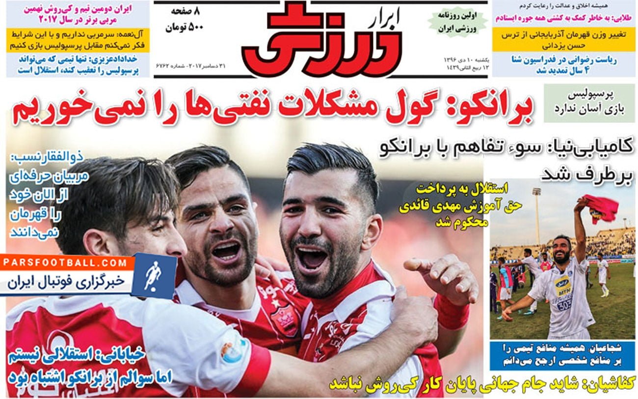 روزنامه ابرار ورزشی ، یکشنبه ۱۰ دی : سوء تفاهم با برانکو حل شد !