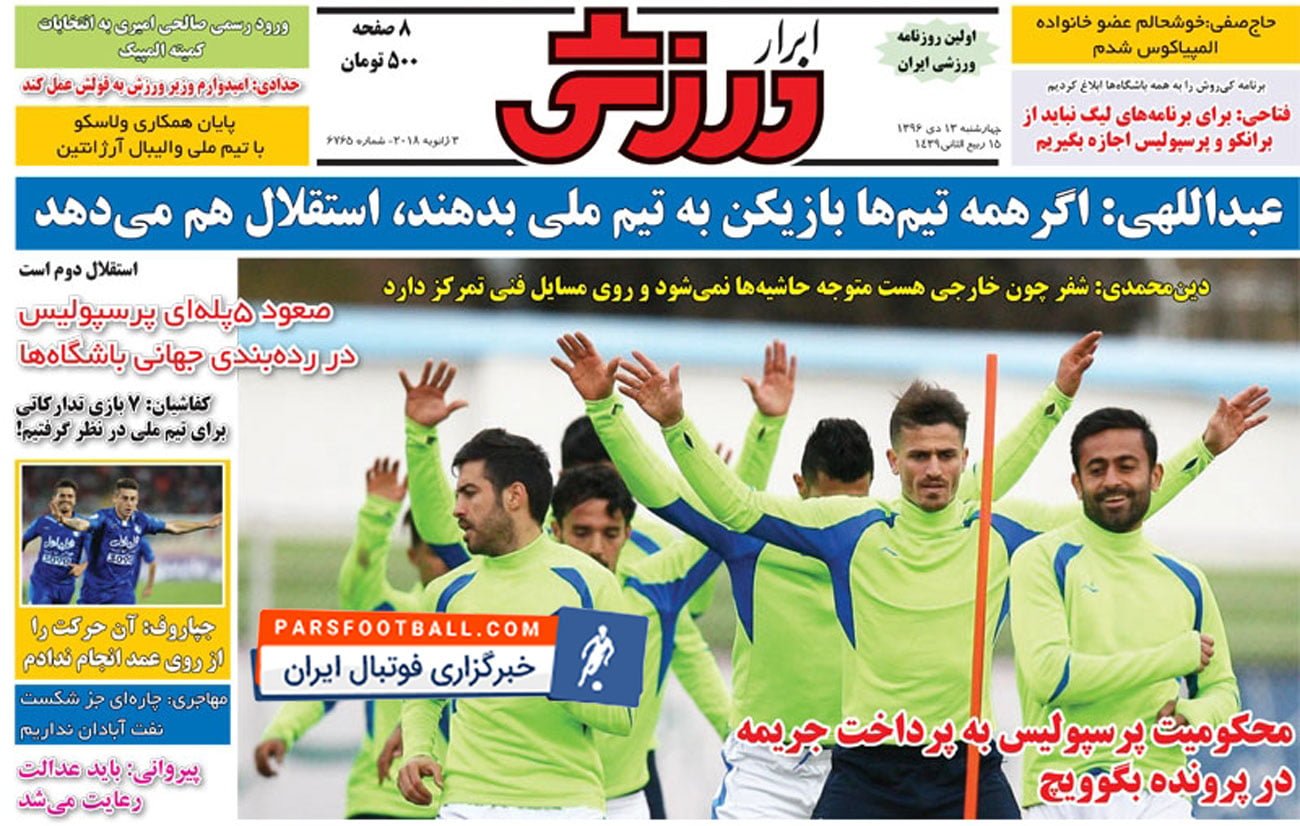 روزنامه ابرار ورزشی ، چهارشنبه ۱۳ دی : محکومیت پرسپولیس به پرداخت جریمه !