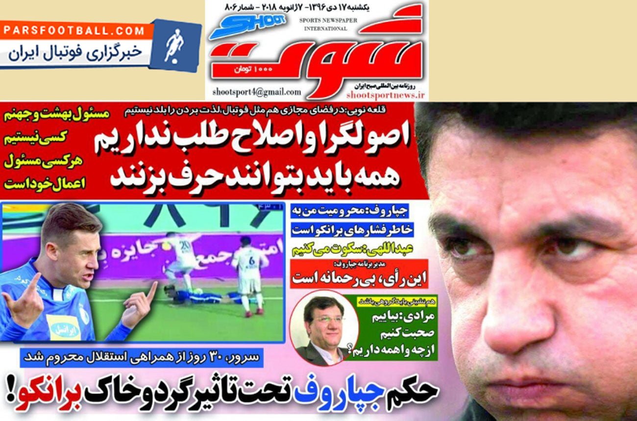 روزنامه شوت ، یکشنبه ۱۷ دی : حکم جپاروف تحت تاثیر گرد و خاک برانکو !