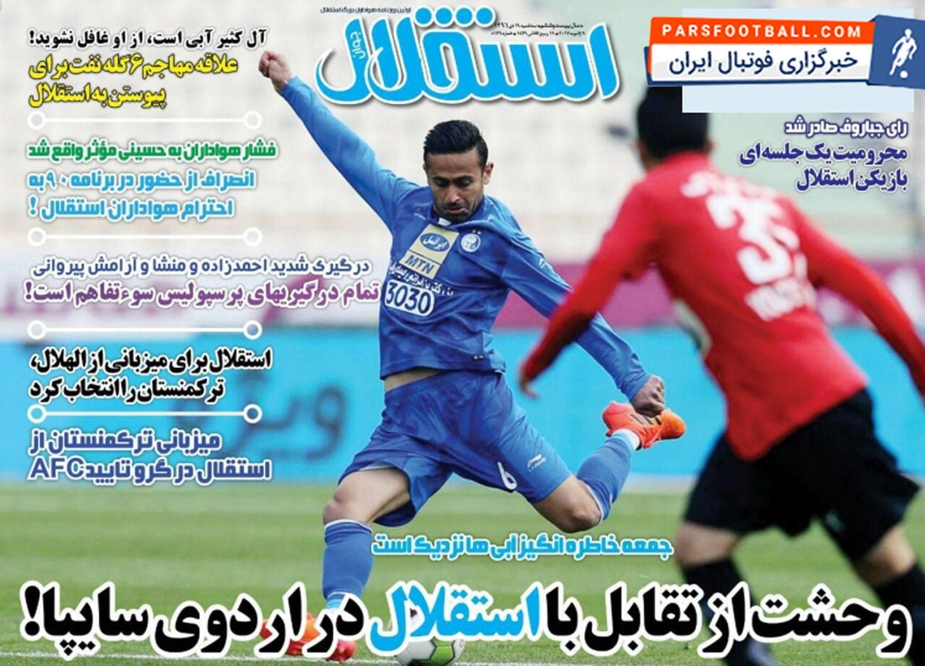 روزنامه استقلال جوان ، سه‌شنبه ۱۹ دی : وحشت از تقابل با استقلال در اردوی سایپا !